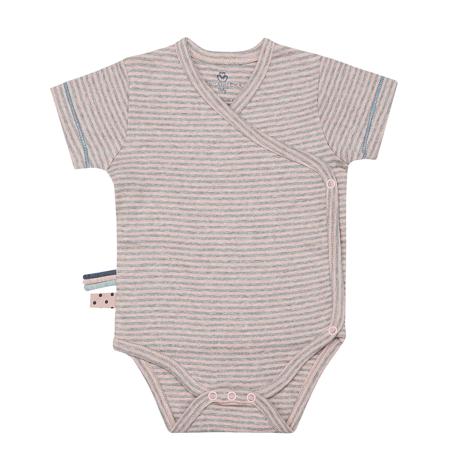 With its soft fabric, which is made of high-quality organic cotton rib , the wrap-over short-sleeved body in striped rose melange by OrganicEra offers the baby a fantastic wearing comfort when playing and relaxing. Because of the high elasticity, a good fit is also achieved. The one-piece suit can be easily put on and taken off by the baby and does not have to be pulled over the head.