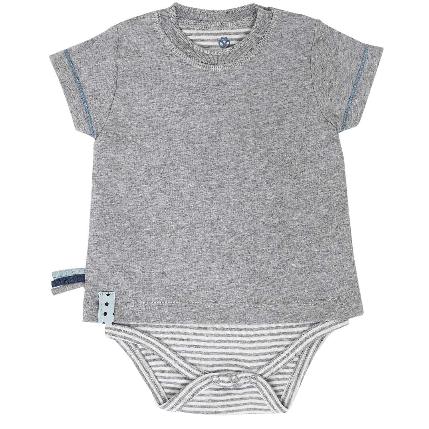 The short-sleeved body shirt in grey melange by OrganicEra is made entirely of soft organic cotton in jersey quality. The striped body is sewn to the neckline of the shirt that lies loosely over it, so that the garment can be put on like a one-piece suit. The inner bodysuit is made of rib fabric. There are snap buttons on the shoulder and crotch.