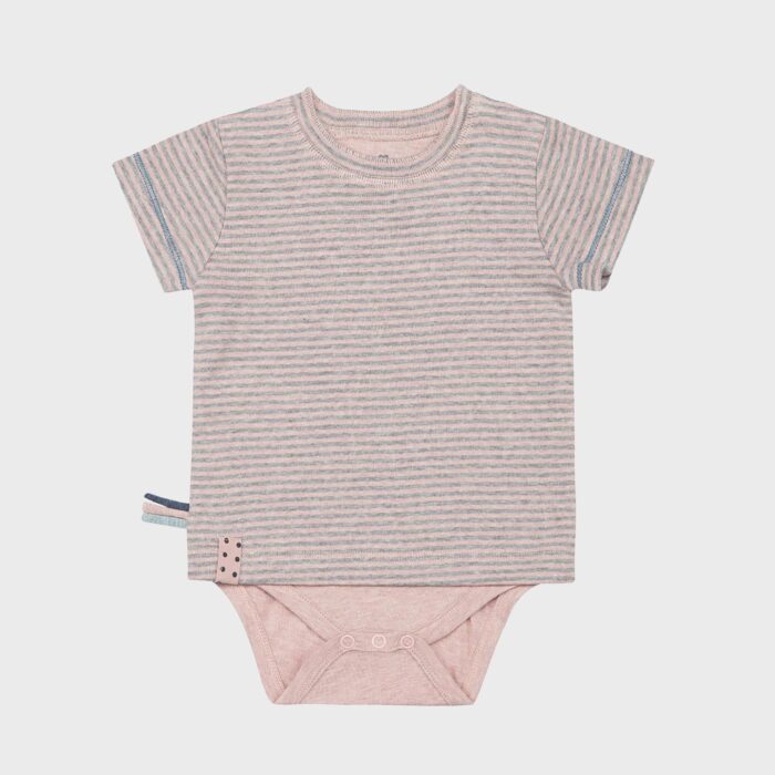 The short-sleeved body shirt in striped rose melange by OrganicEra is made entirely of soft organic cotton in jersey quality. The striped body is sewn to the neckline of the shirt that lies loosely over it, so that the garment can be put on like a one-piece suit. The inner bodysuit is made of rib fabric. There are snap buttons on the shoulder and crotch.